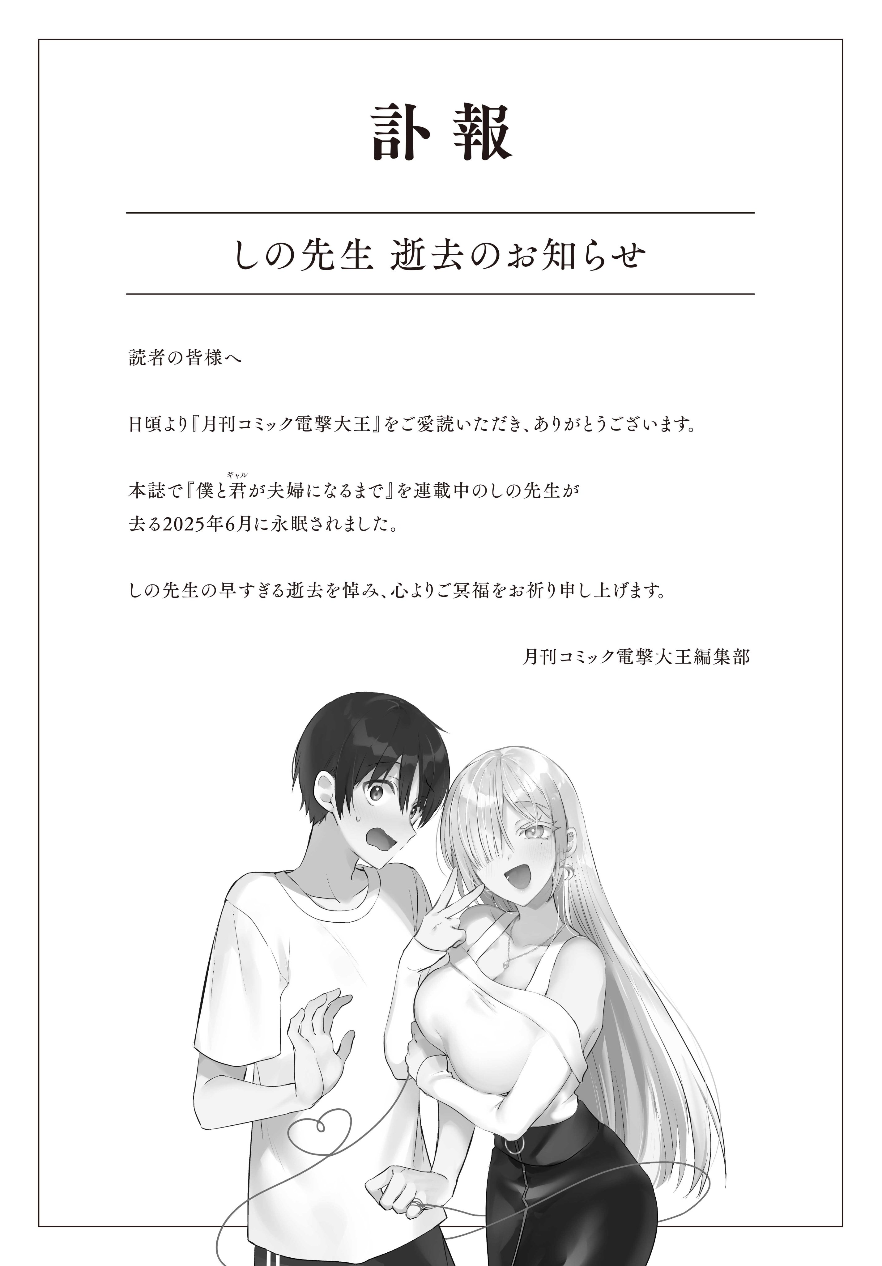 - 編集部は「しの先生 逝去のお知らせ」と題し、以下のように報告しました: 「本誌で『僕と君が夫婦になるまで』を連載中のしの先生が去る2025年6月に永眠されました。しの先生の早すぎる逝去を悼み、心よりご冥福をお祈り申し上げます」