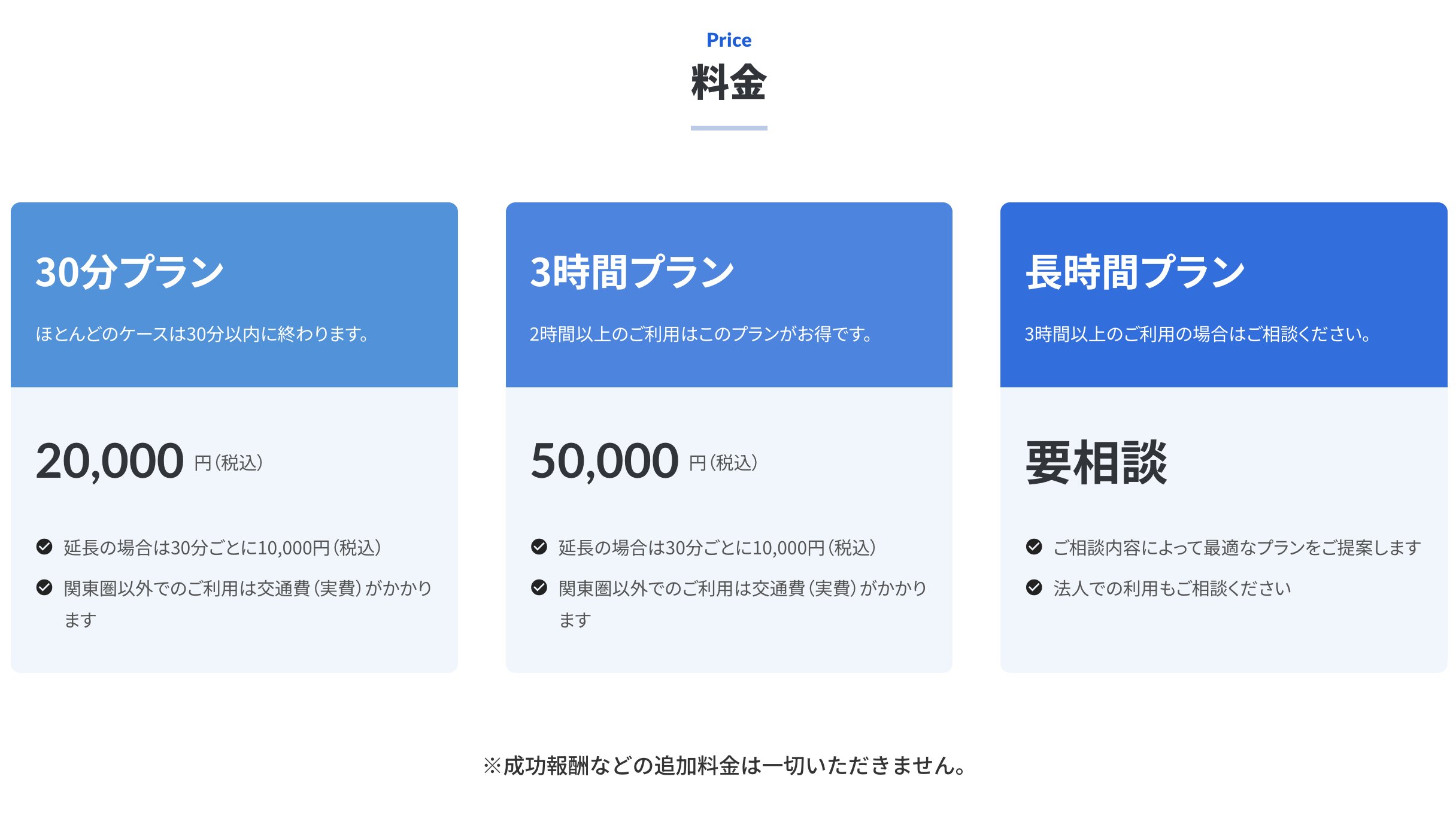- 料金目安:30分プラン2万円、3時間プラン5万円。公式では「ほとんどは30分以内で終了する」との説明。